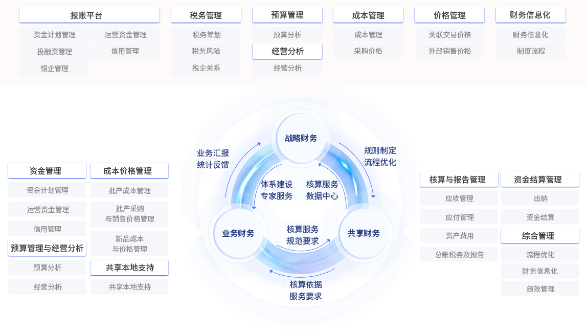 通过构建财务共享,剥离会计核算职能,使业务财务专注于管理会计和业务支持,实现财务运营模式的变革,更好地支持业务创新发展与管理能力提升