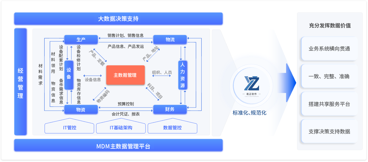 MDM建设的核心价值是统一管理数据。统一各业务环节的数据管理标准,数据全生命周期管理,使数据的质量、